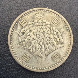 1959年から発行された100円硬貨で、裏面に稲穂のデザインが描かれています。